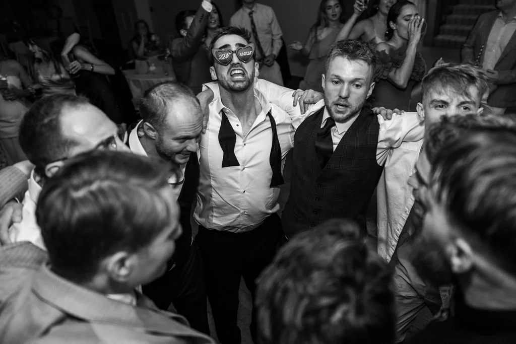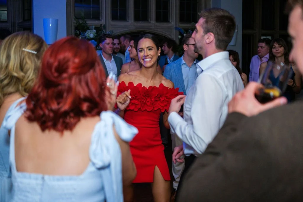 As the sun dropped, the Music Room shifted into full party mode with a brilliant live band getting everyone moving. Later in the evening, Zita changed into a stunning red dress – a traditional colour for her – and made her grand entrance down the sweeping staircase straight onto the dance floor. The room absolutely erupted; it was one of those moments that felt like pure celebration, with the band playing louder, guests cheering and the energy just skyrocketing from there. Guests drifted between the bar, terrace and dance floor, the hills turned that soft evening blue, and the night carried on exactly as a wedding that good should.