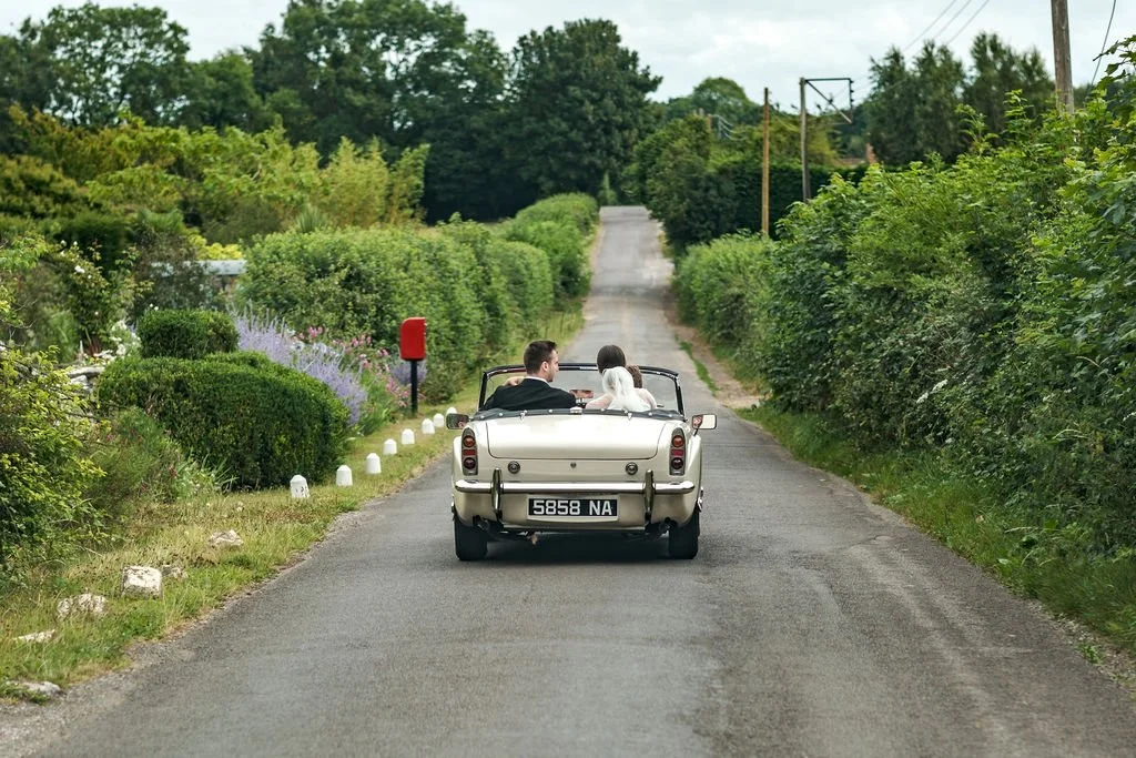 After confetti on the church steps, it was time to swap stone walls for countryside views. Zita and Neil headed off towards Coombe Lodge in the bridal car, and Em tucked in behind them in our car, window down, lens out, grabbing photos along the lanes as they went. There’s something really special about those in‑between moments – just‑married smiles in the rear‑view mirror, a dress spilling over the back seat, the two of them finally breathing for a second with no one else in the car.