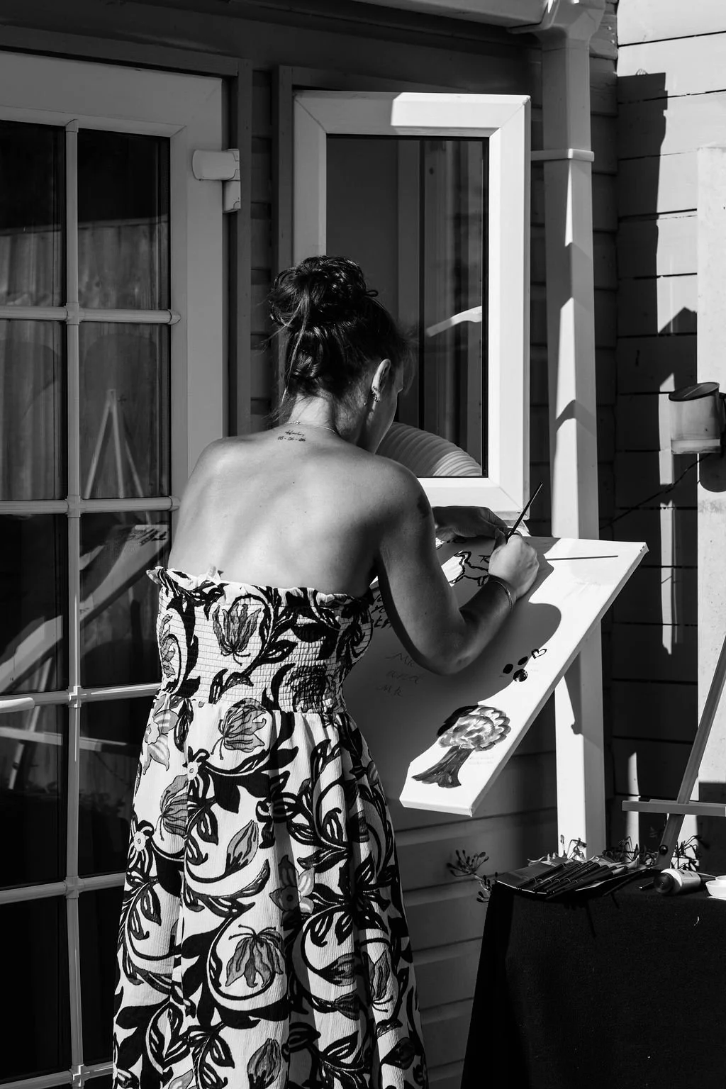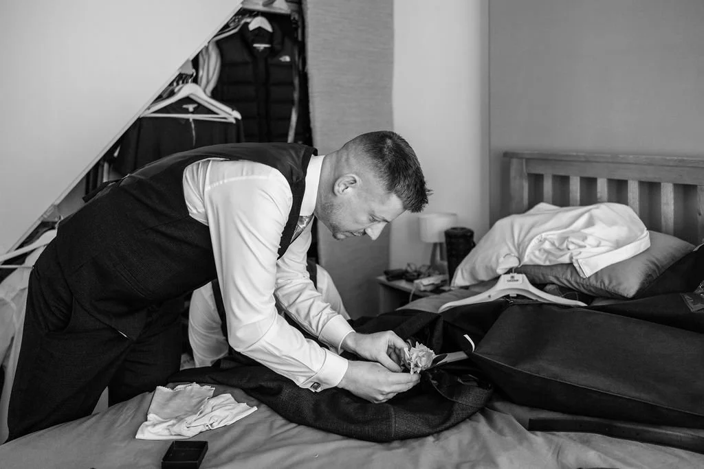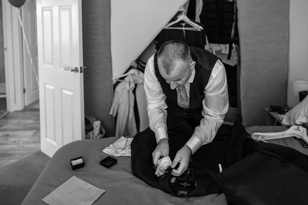 I arrived at their home while everything was still quiet, with the final touches being made and their outfits hanging up, ready to go. The morning unfolded gently – music on in the background and that mix of nerves and excitement that always comes just before guests arrive. The final tweaks were being made in the garden, which Matt had lovingly restored and recreated to make it perfect for their wedding day celebrations.