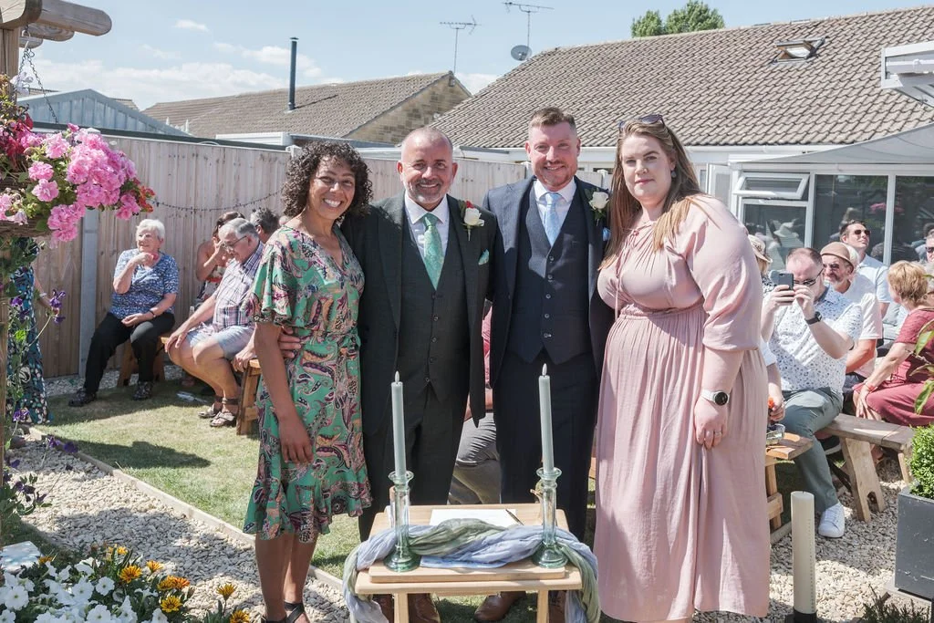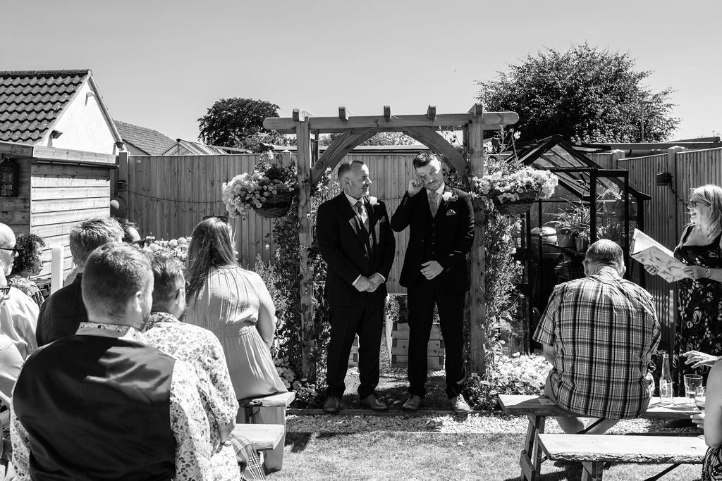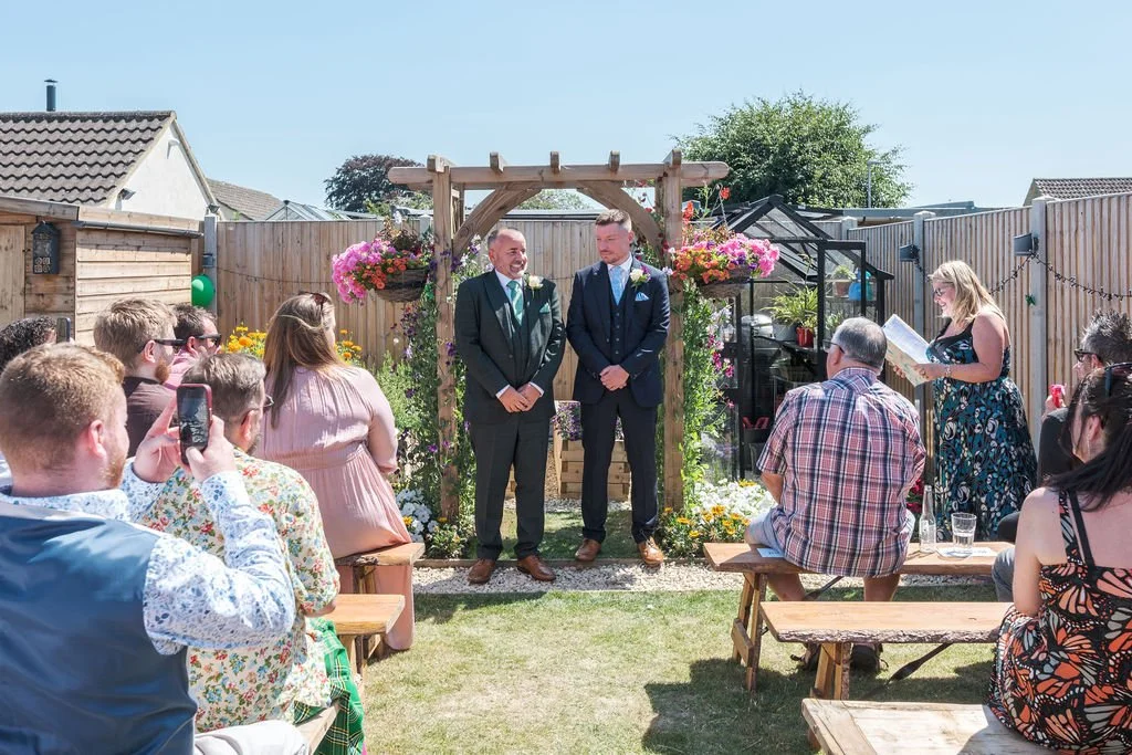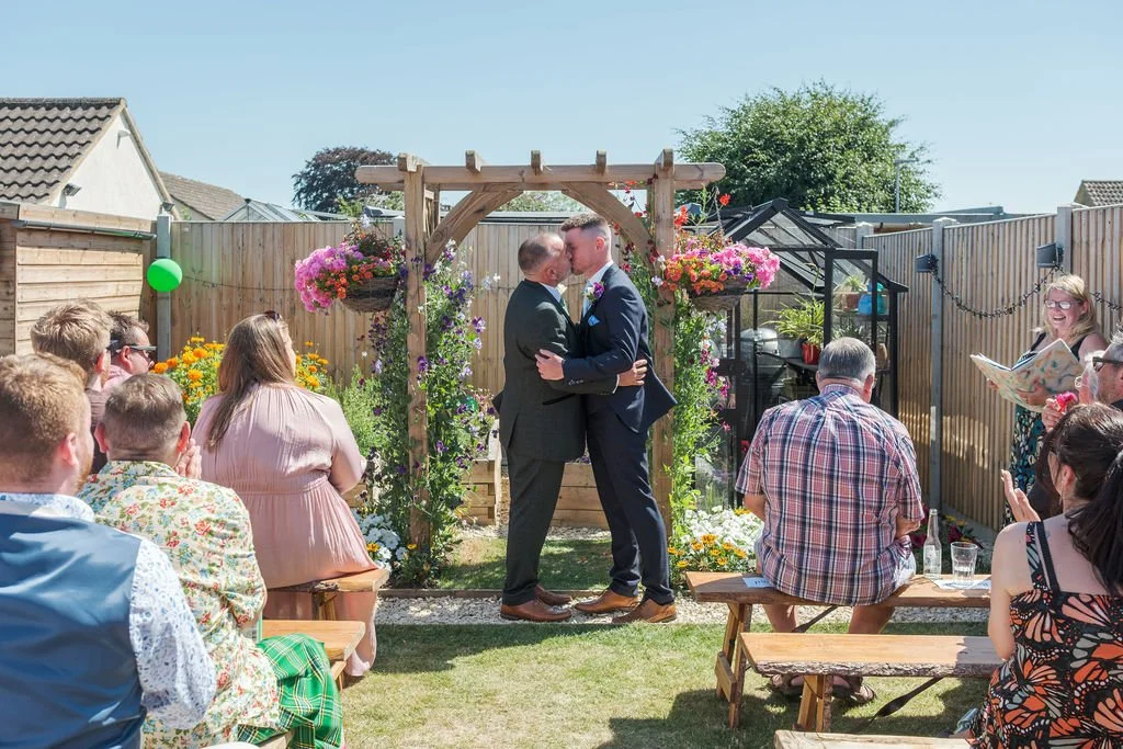 Their ceremony took place right in the middle of their garden, using beautiful flowers, an archway and layout that were perfect as their backdrop. Friends and family gathered for their ceremony under the baking hot sun - the rings being blessed prior to Matt and Ben leaving their house into the garden - everyone close enough to really feel part of their magic.