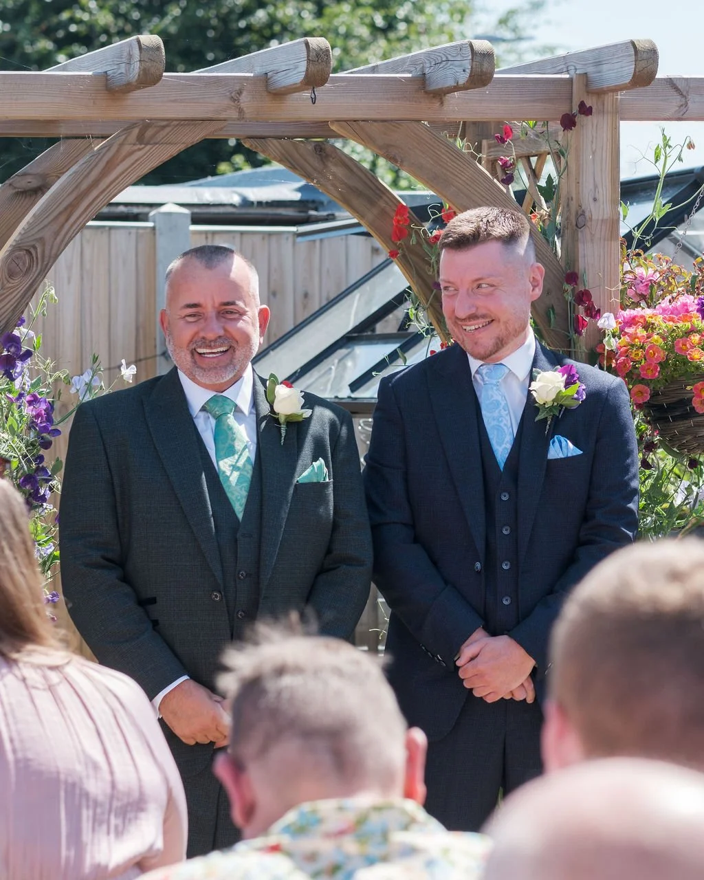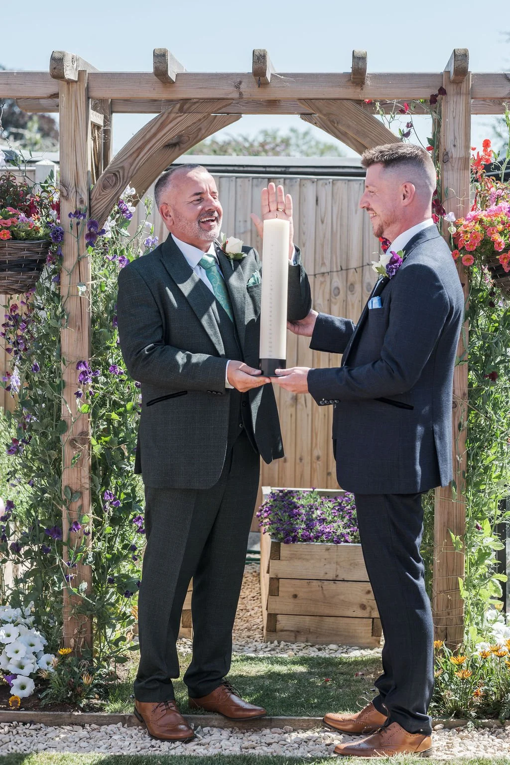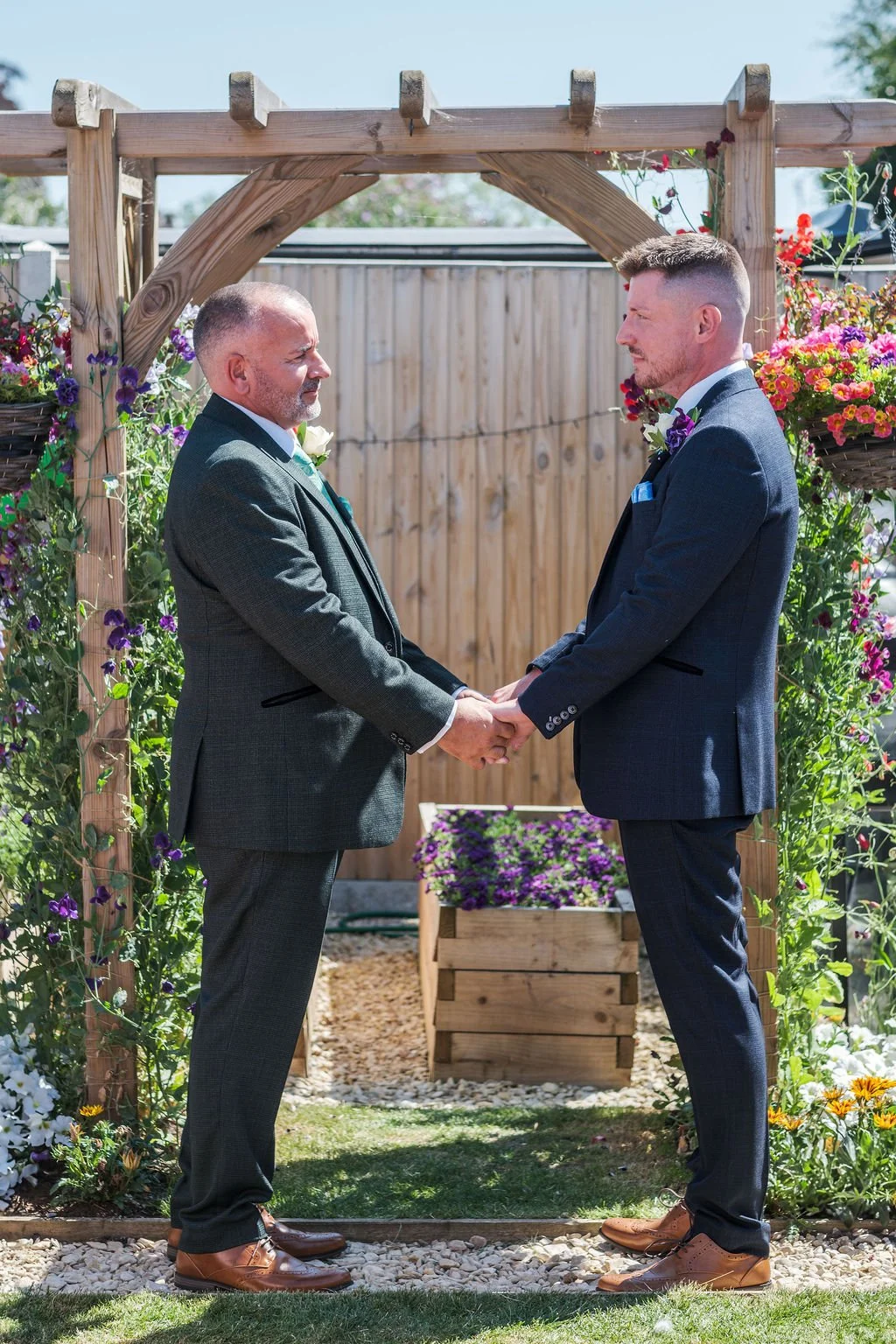 Their ceremony took place right in the middle of their garden, using beautiful flowers, an archway and layout that were perfect as their backdrop. Friends and family gathered for their ceremony under the baking hot sun - the rings being blessed prior to Matt and Ben leaving their house into the garden - everyone close enough to really feel part of their magic.