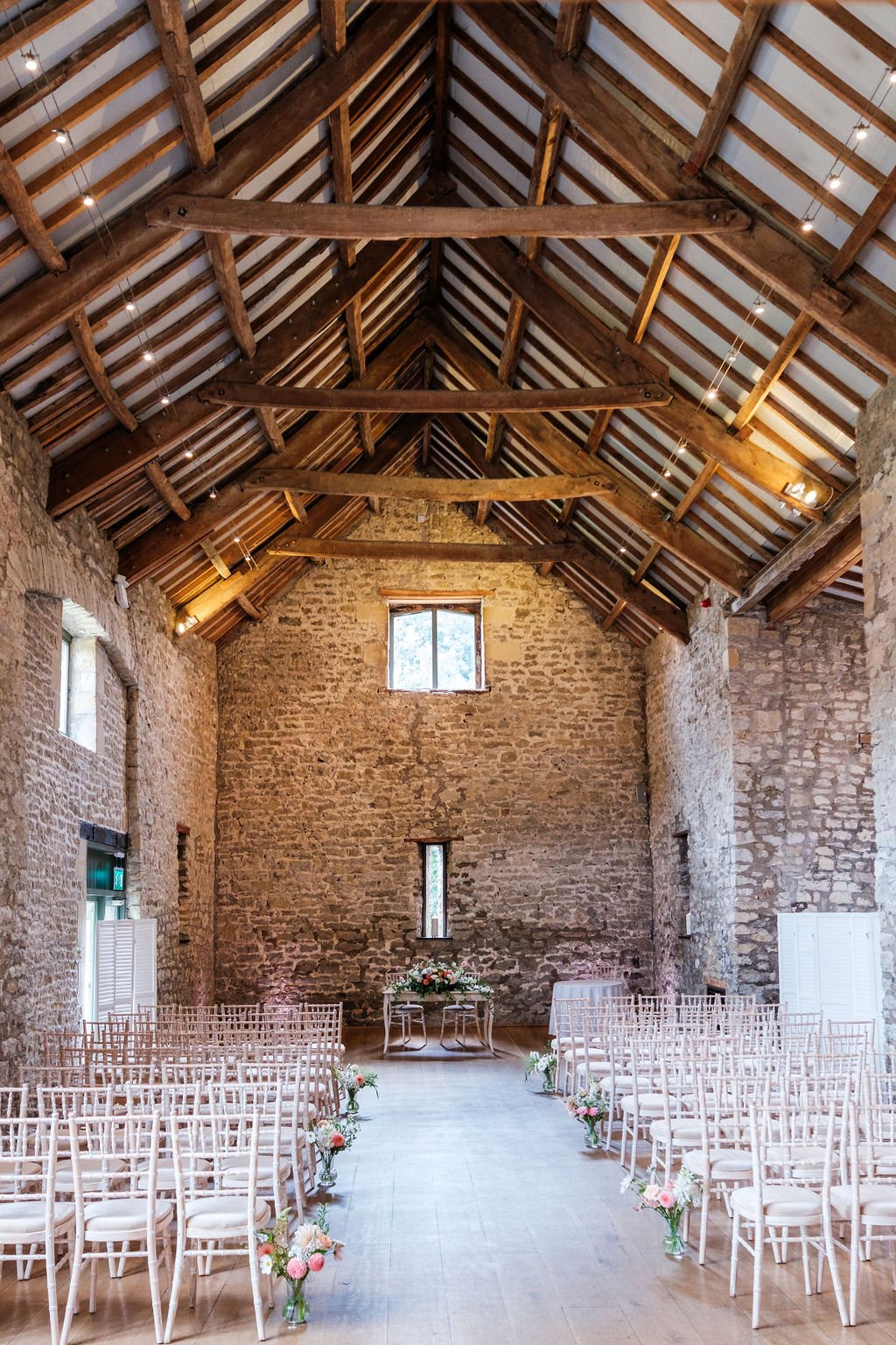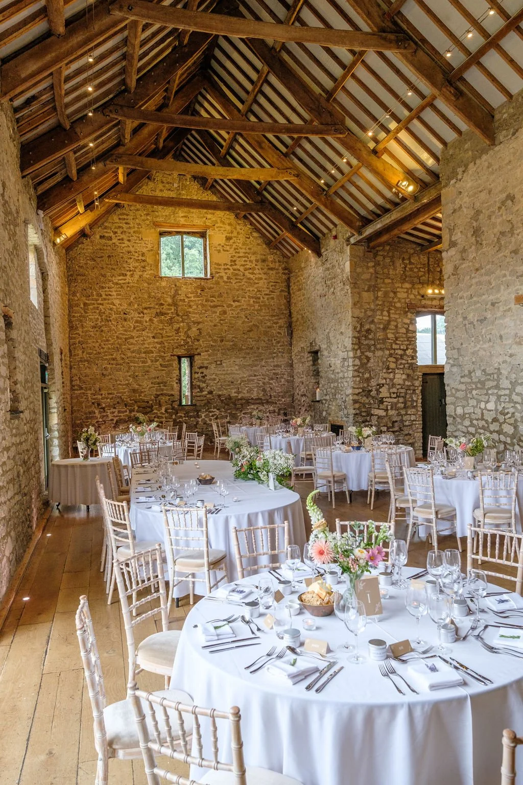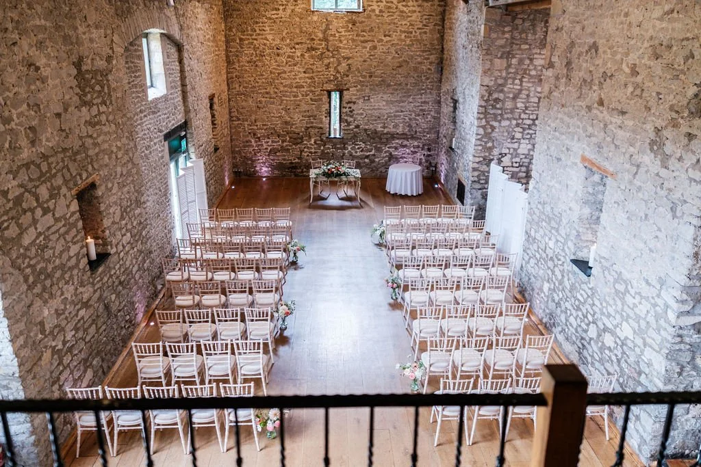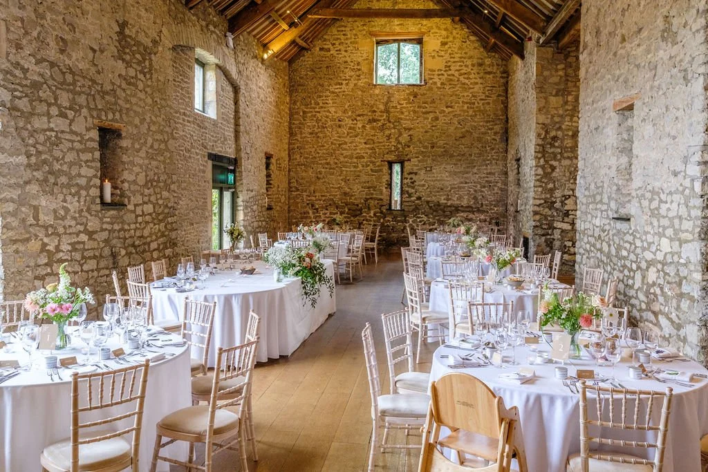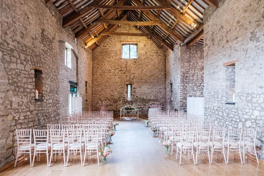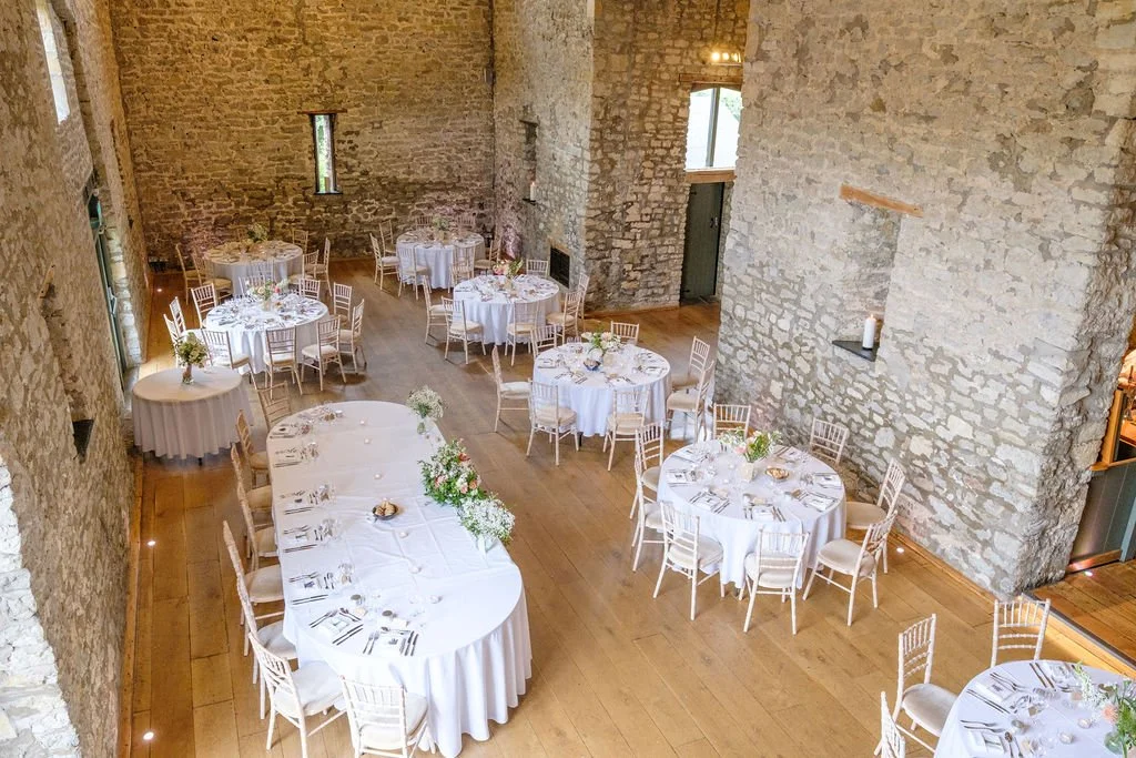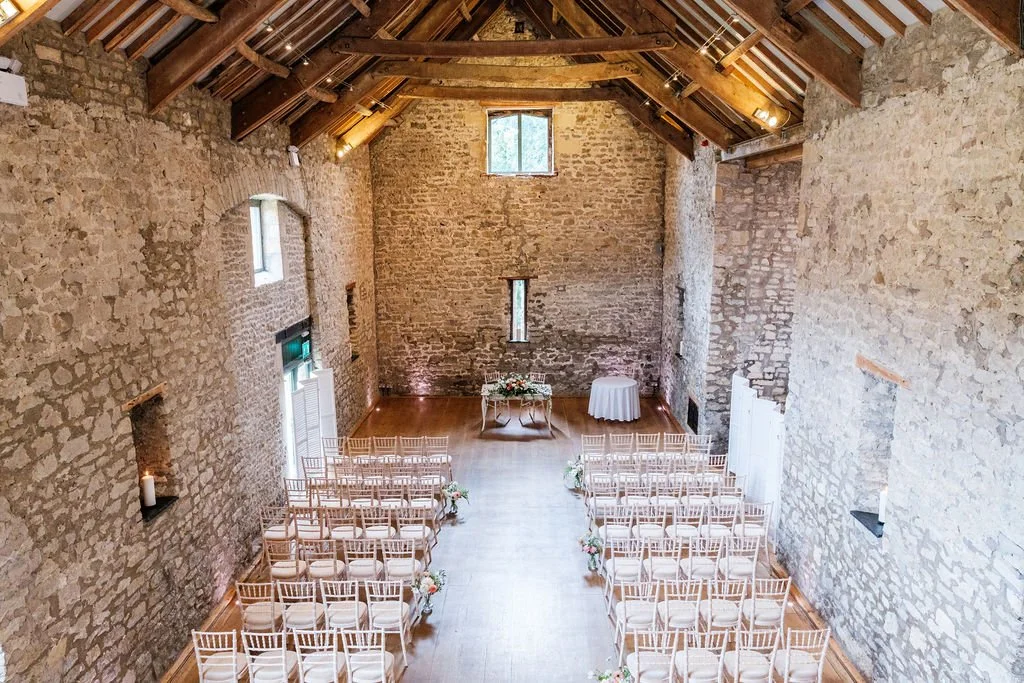 The Tythe Barn is a spectacular stone‑walled barn with rustic beams, high ceilings and space for around 50–150 guests for ceremonies and wedding breakfasts, and up to about 200 for the evening party. Set against far‑reaching countryside views, it’s ideal for couples dreaming of a classic barn wedding that still feels elegant and polished.
