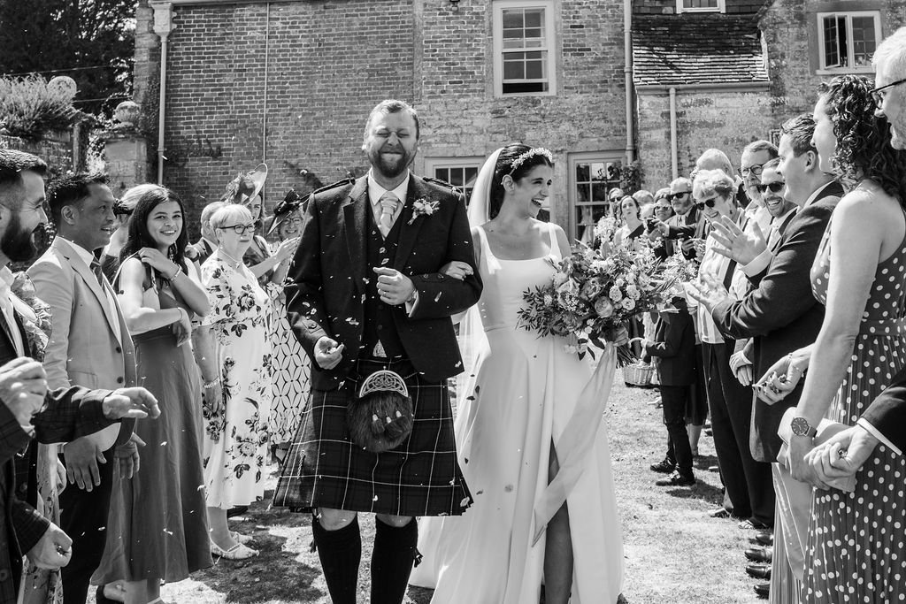 After the ceremony, everyone spilled out into the gardens for confetti, drinks, and music. The lush lawns and colourful flowers made the perfect backdrop for laughter-filled moments and natural, candid photos. Children kicked off their shoes and ran about, glasses were raised in the sunshine, and Holly and Johnny stole a quiet moment together for some relaxed, romantic portraits among the grasses and woodland.