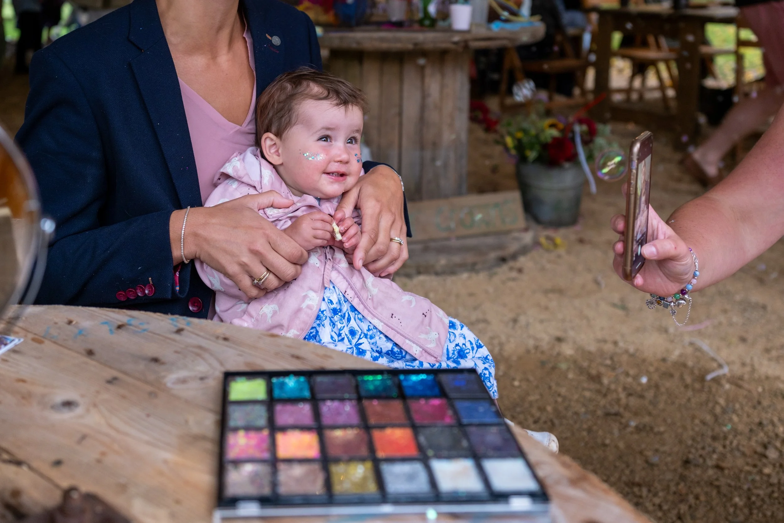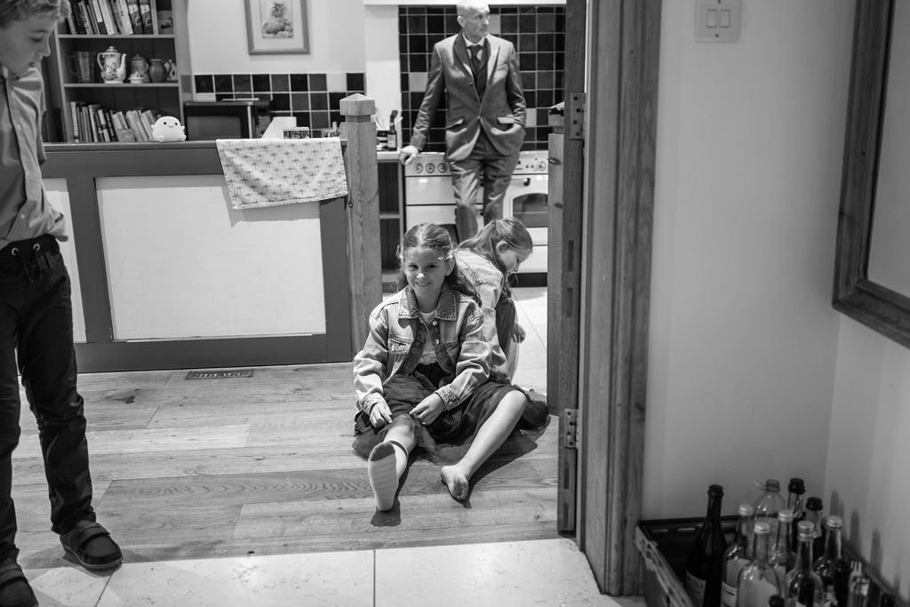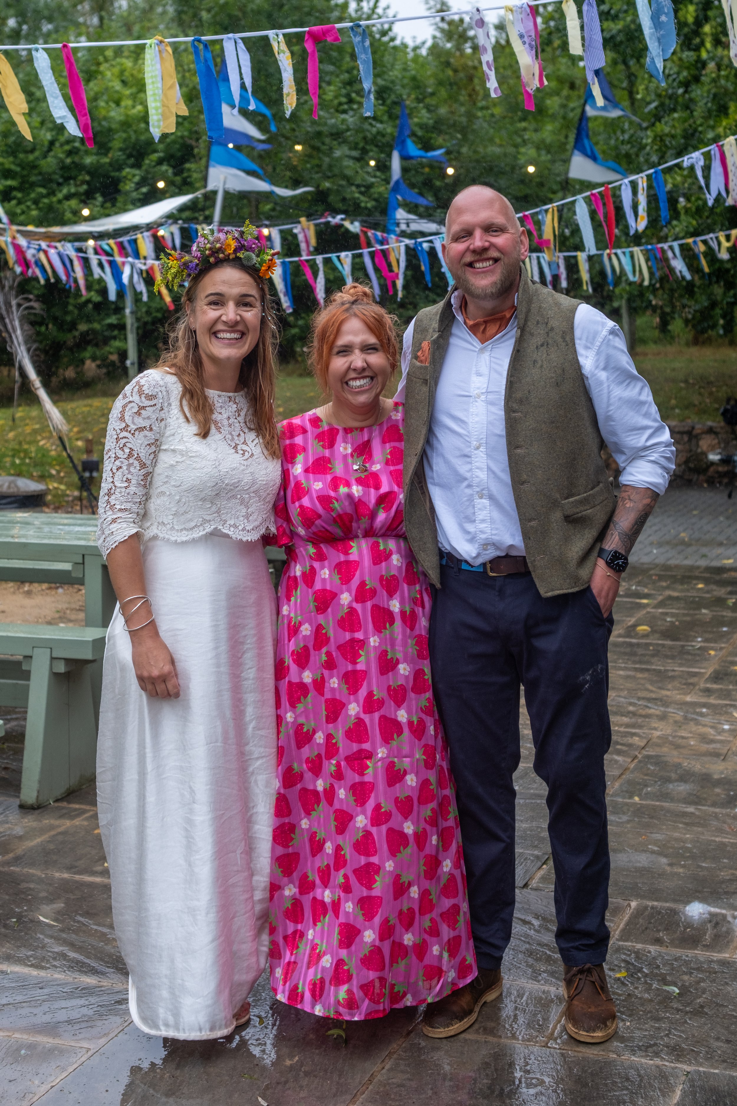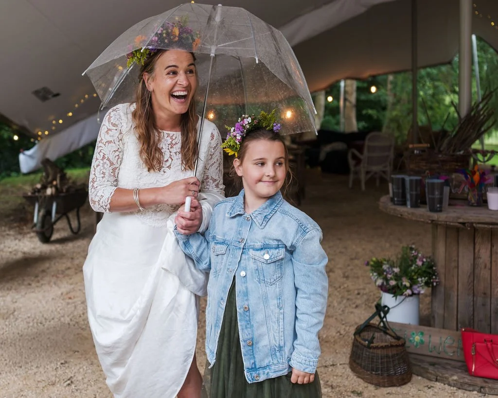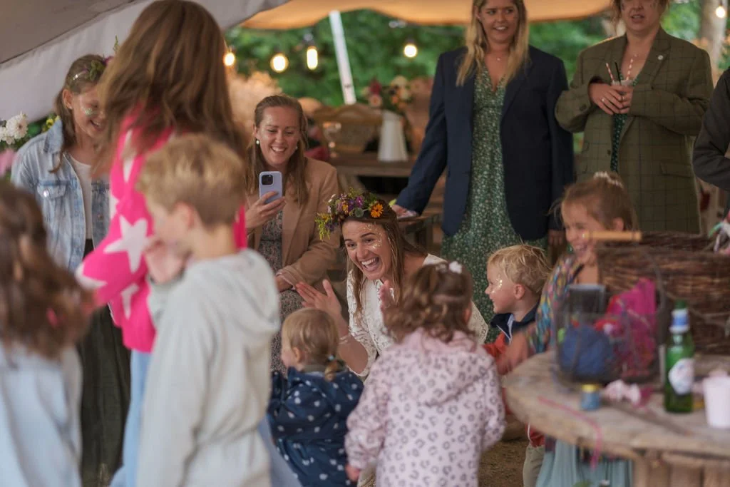 Post-ceremony, everyone dashed back to the stretch marquee and Old Dairy Barn, the four girls leading the charge, dripping and giggling. Downpour raged on, but the mood lifted — drinks flowing, laughs bouncing off the rustic beams and canvas walls. Love how Higher Holcombe keeps it all close: woods to barn, no rushing. We slipped about, catching those soaked-but-happy family moments.