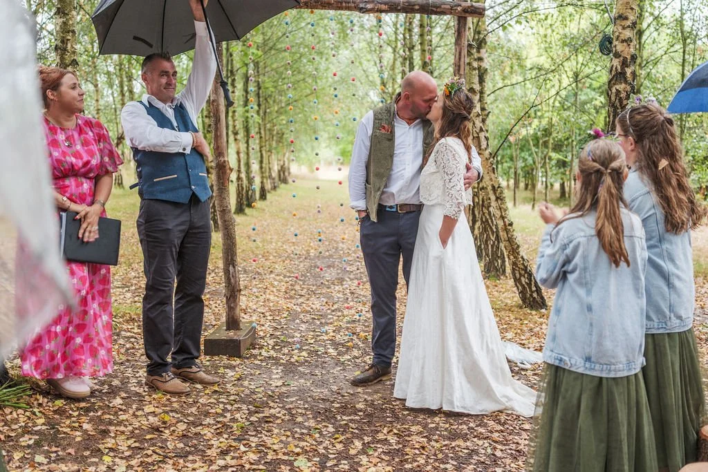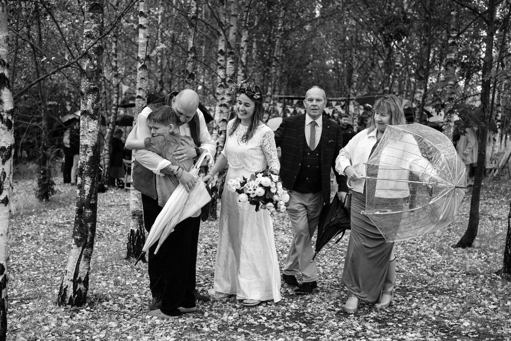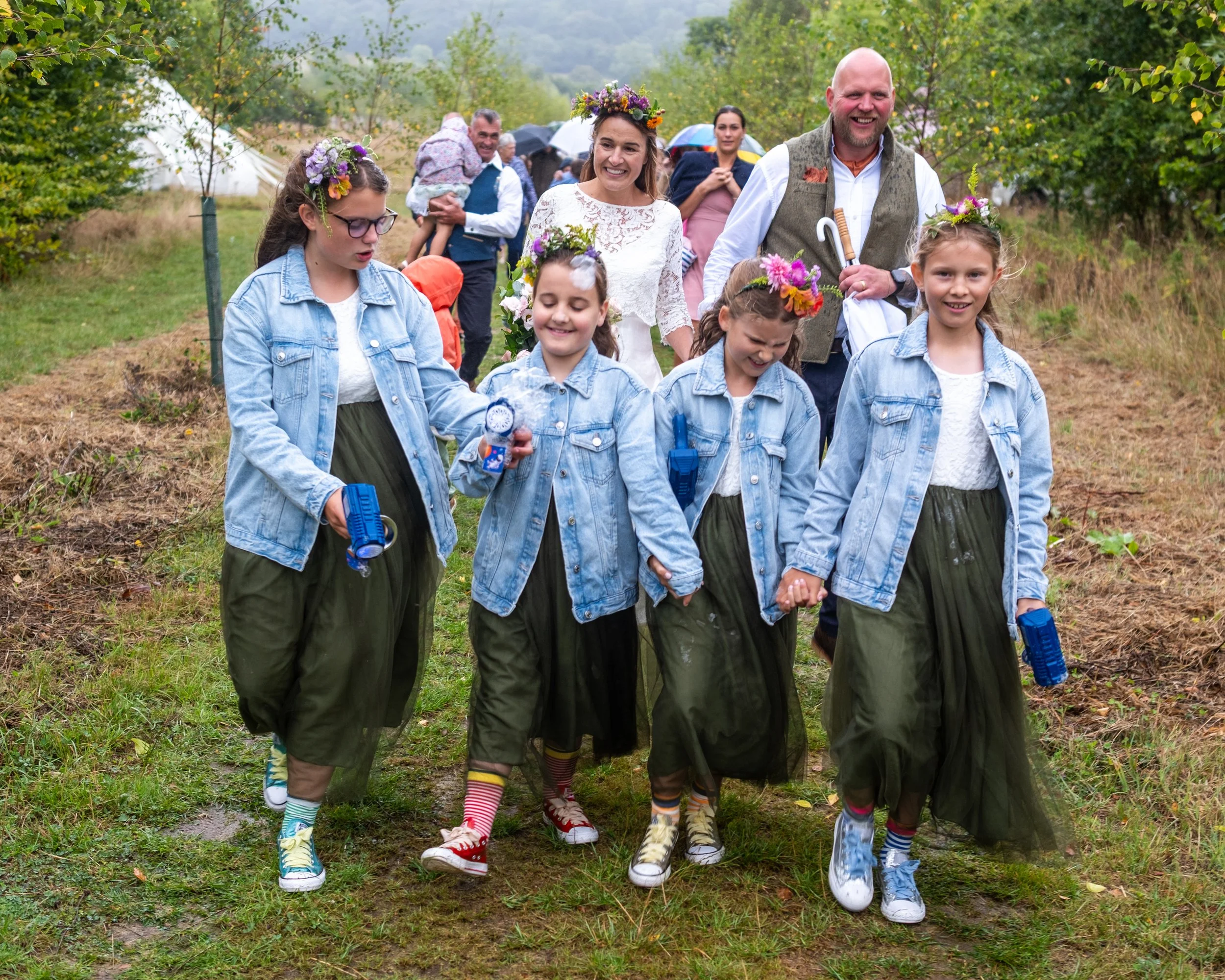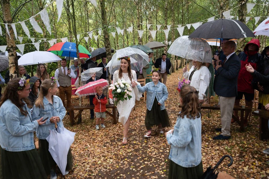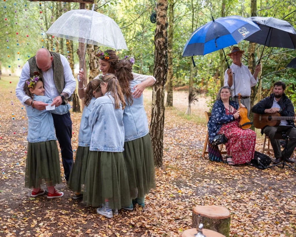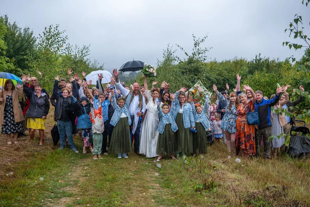 Nestled in unspoilt Devon countryside, just minutes from Exeter. That silver birch church in the woods — white trunks like a natural aisle, leaves whispering overhead. Downpour hit as guests arrived, heavy and relentless, turning everything misty and intimate. Rebecca, Oliver and their four girls leaned right into it. No fuss. Just real.