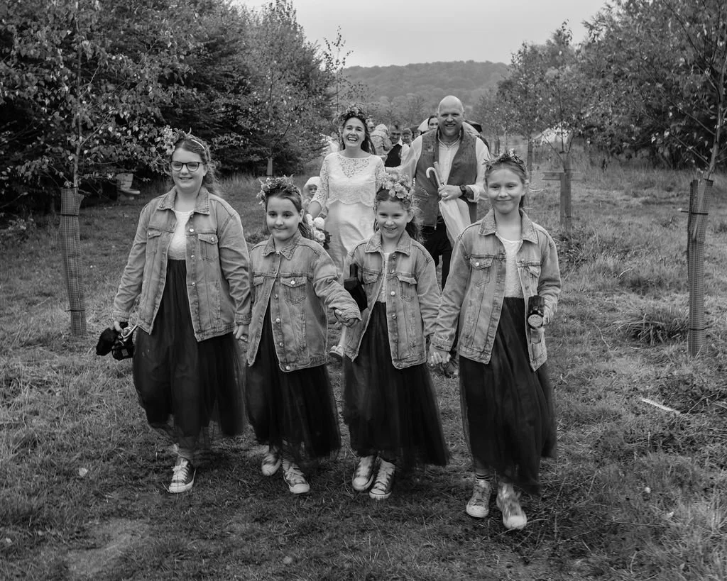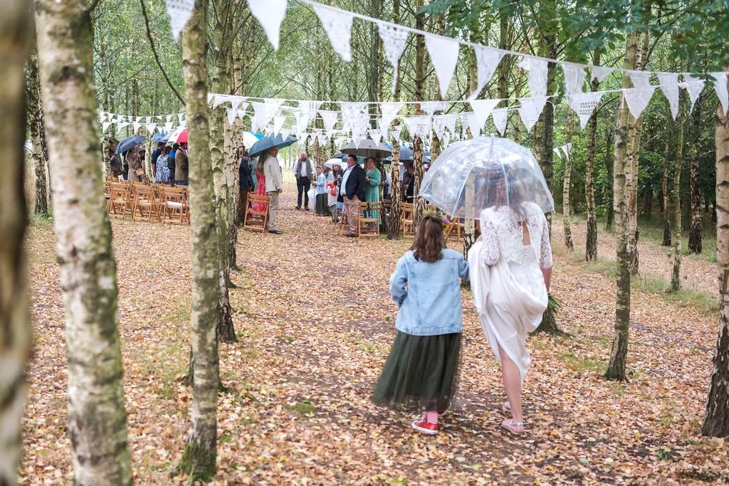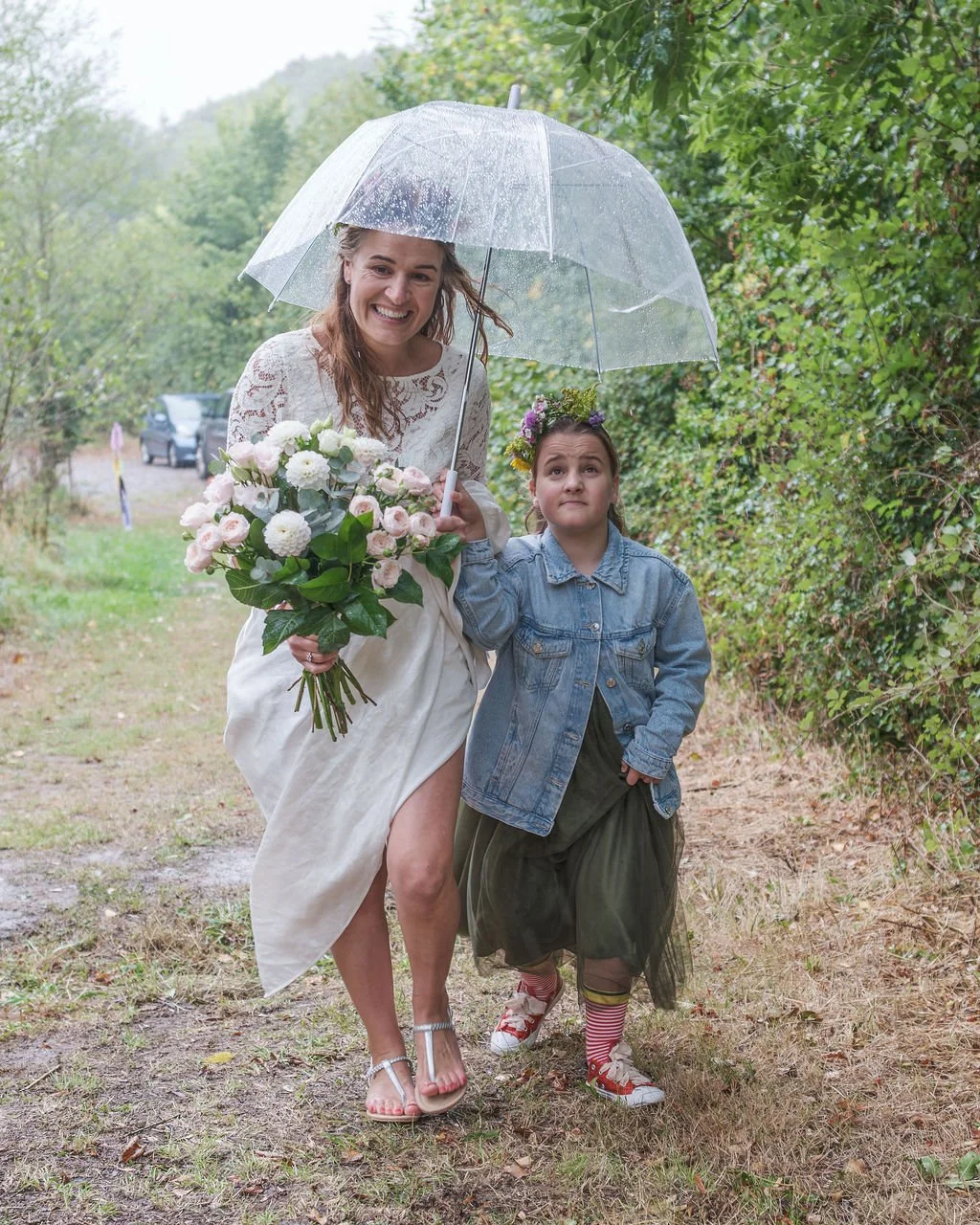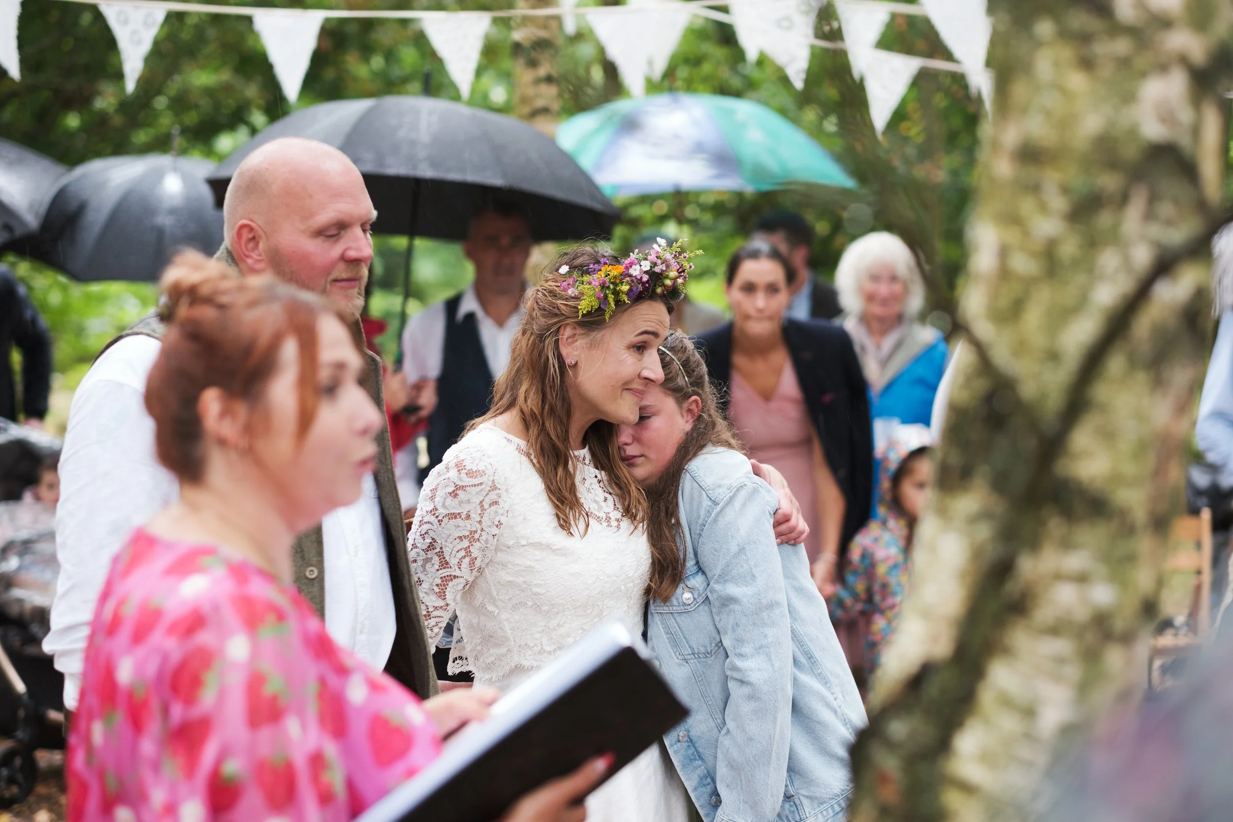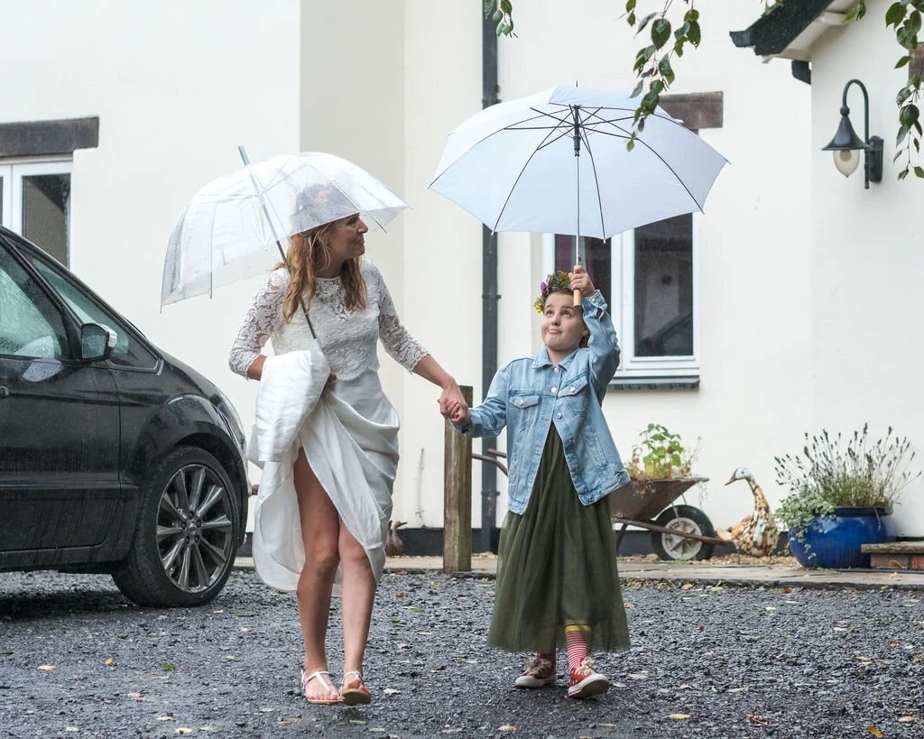 Nestled in unspoilt Devon countryside, just minutes from Exeter. That silver birch church in the woods — white trunks like a natural aisle, leaves whispering overhead. Downpour hit as guests arrived, heavy and relentless, turning everything misty and intimate. Rebecca, Oliver and their four girls leaned right into it. No fuss. Just real.