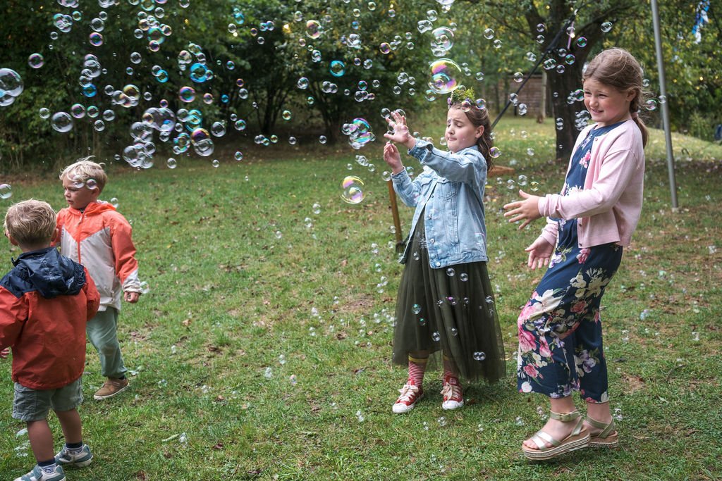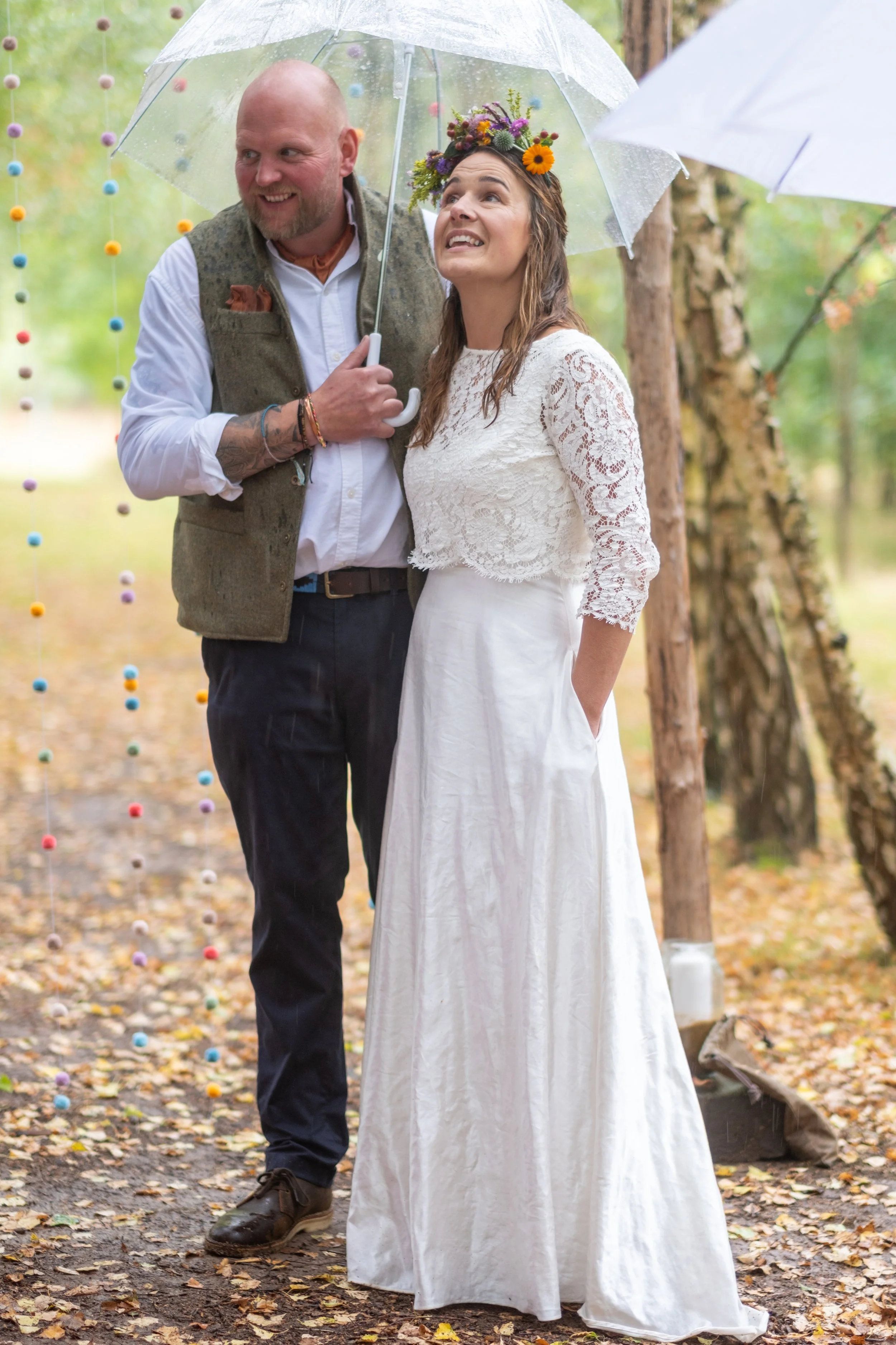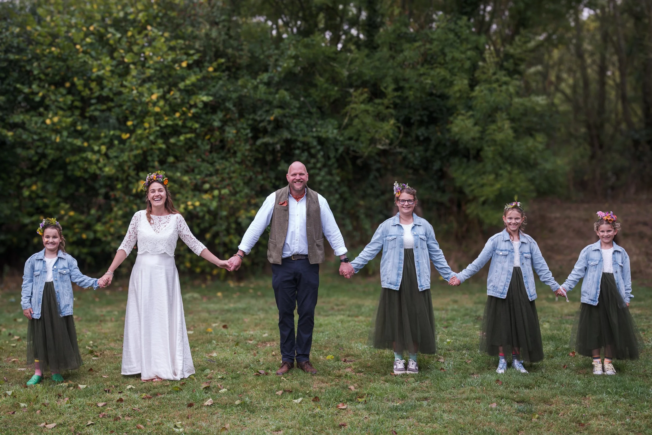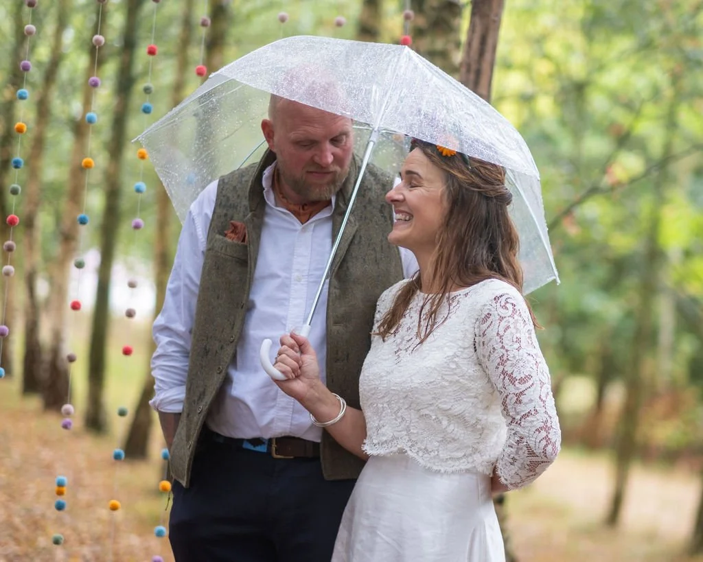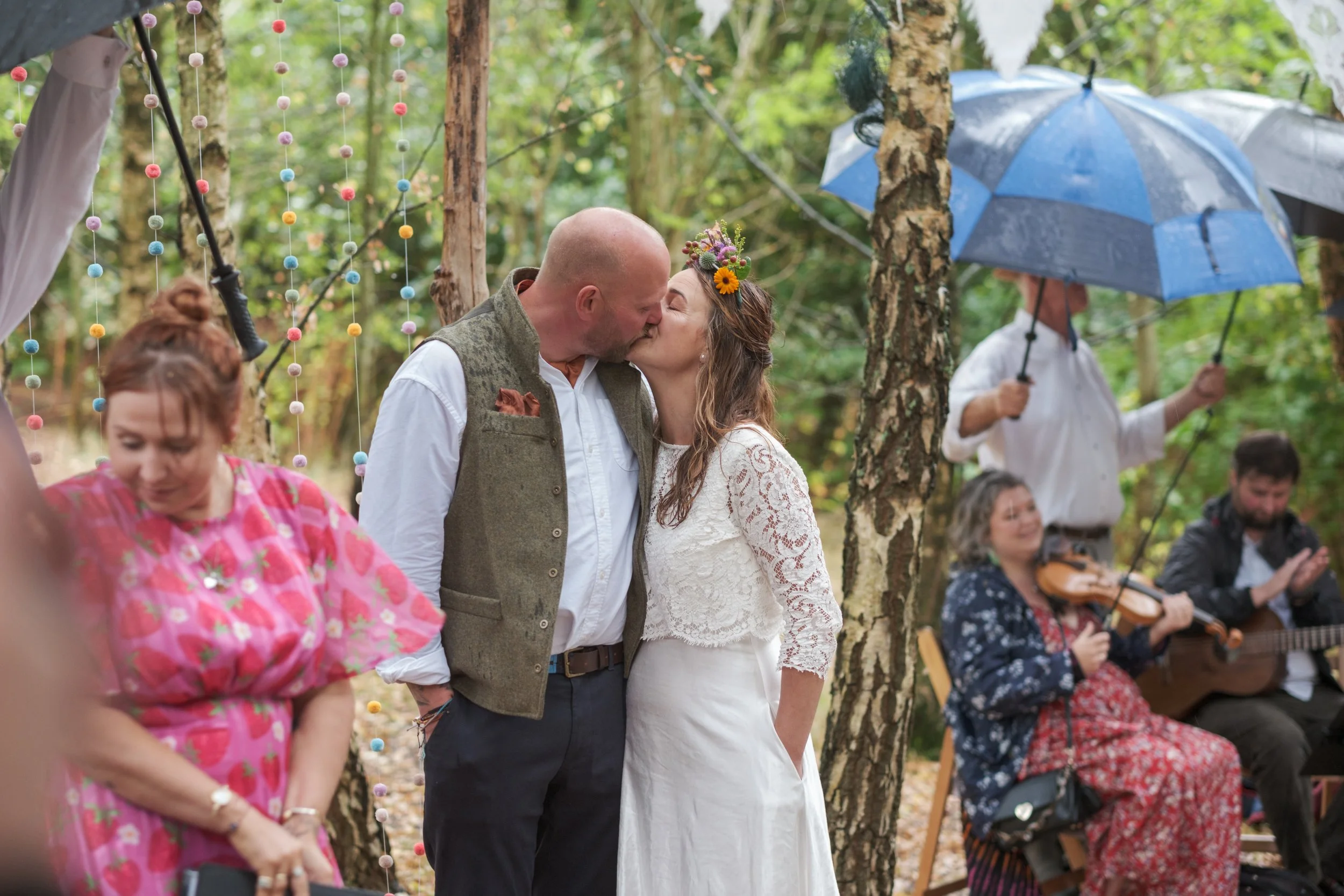 Nestled in unspoilt Devon countryside, just minutes from Exeter. That silver birch church in the woods — white trunks like a natural aisle, leaves whispering overhead. Downpour hit as guests arrived, heavy and relentless, turning everything misty and intimate. Rebecca, Oliver and their four girls leaned right into it. No fuss. Just real.