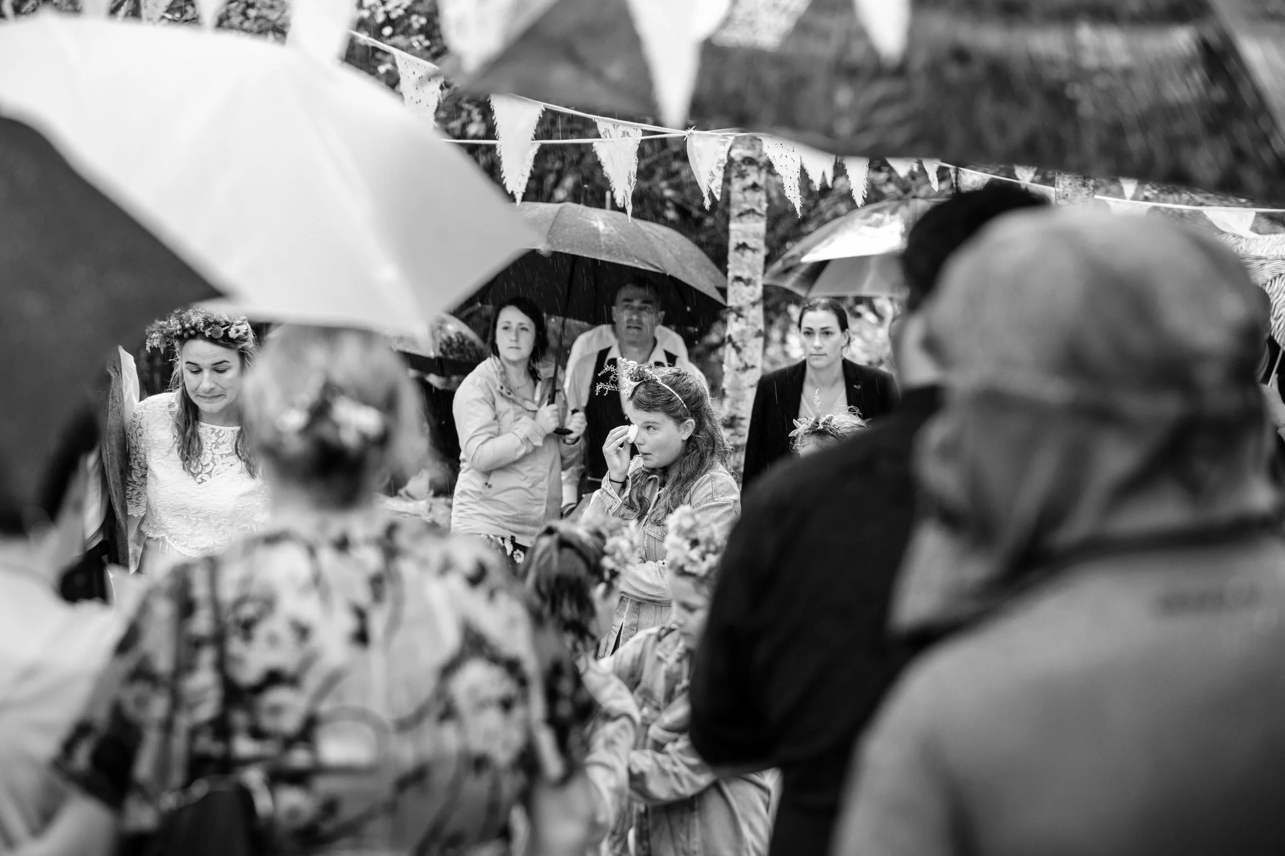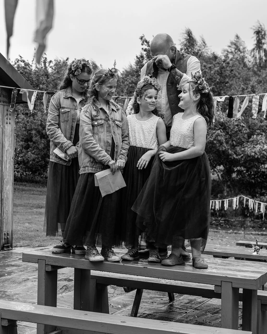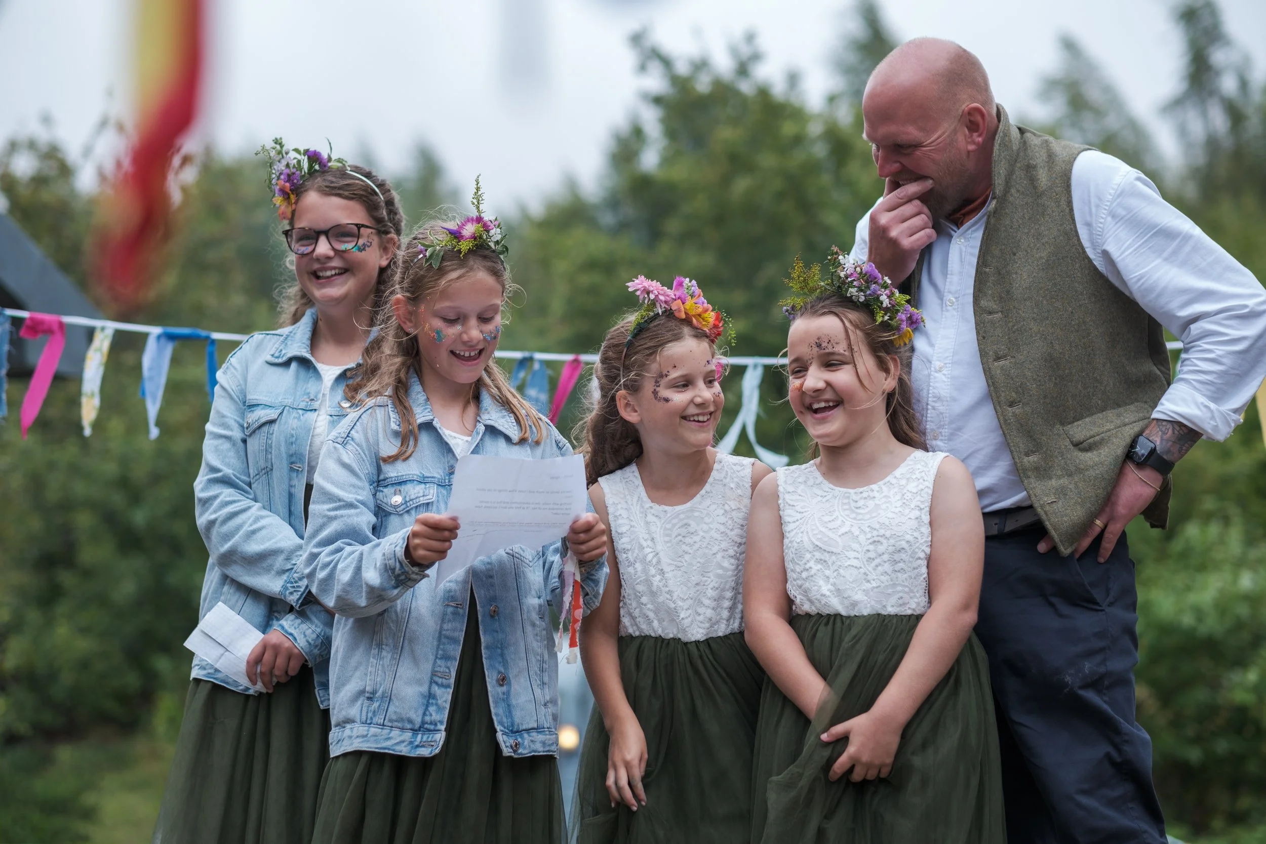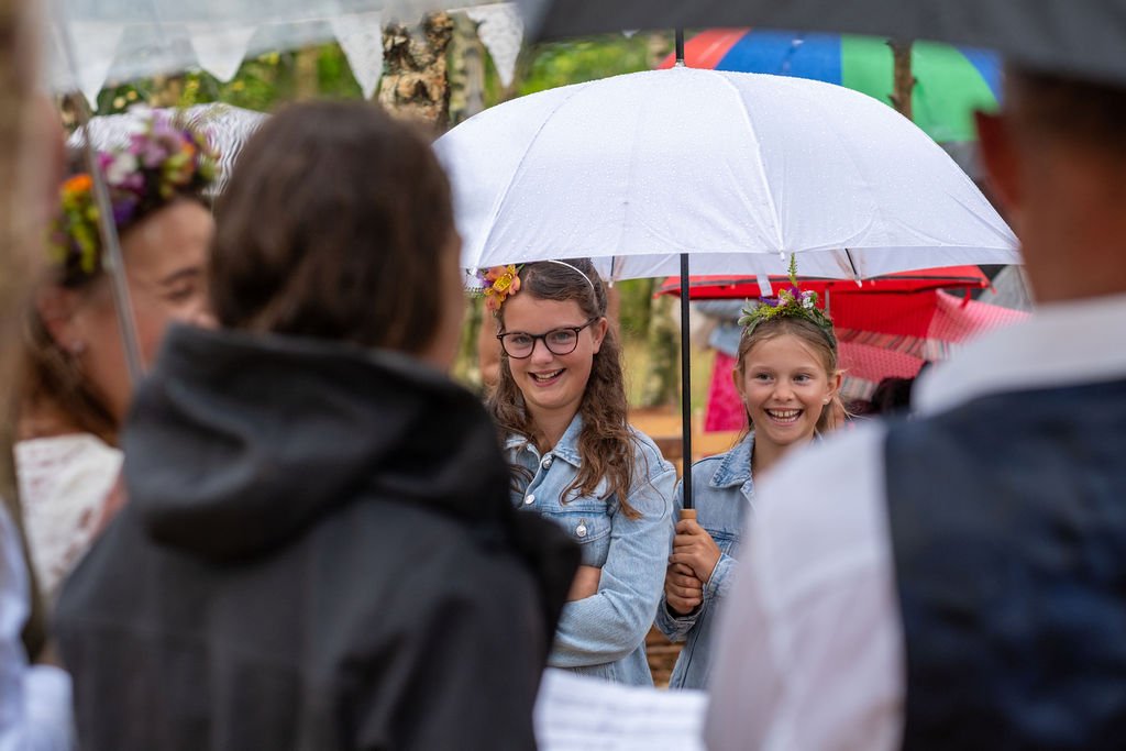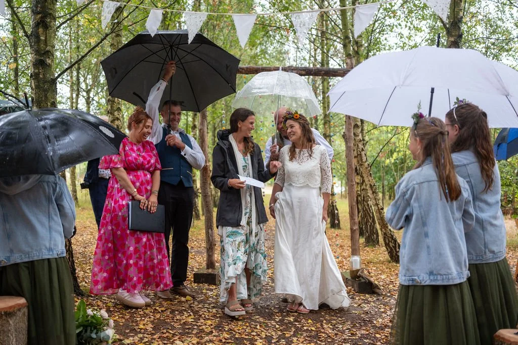 Ceremony hit hard. A pair of musicians played in the trees — fiddles and voices weaving through the birch, rain lashing around them. Vows exchanged under that shady canopy, the girls beaming and teary right there in the heart of it. Emotional doesn’t cover it. Proper heart stuff.