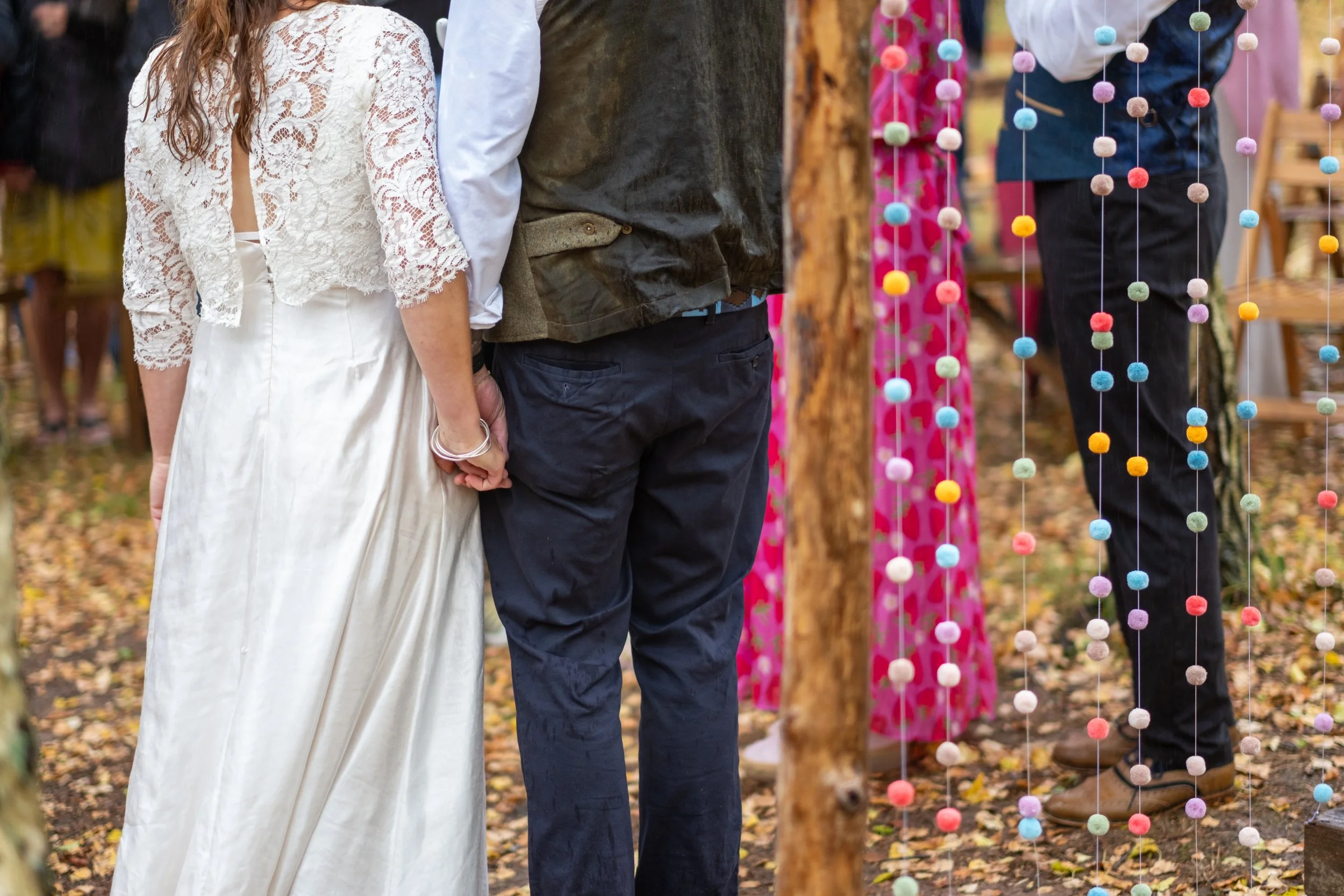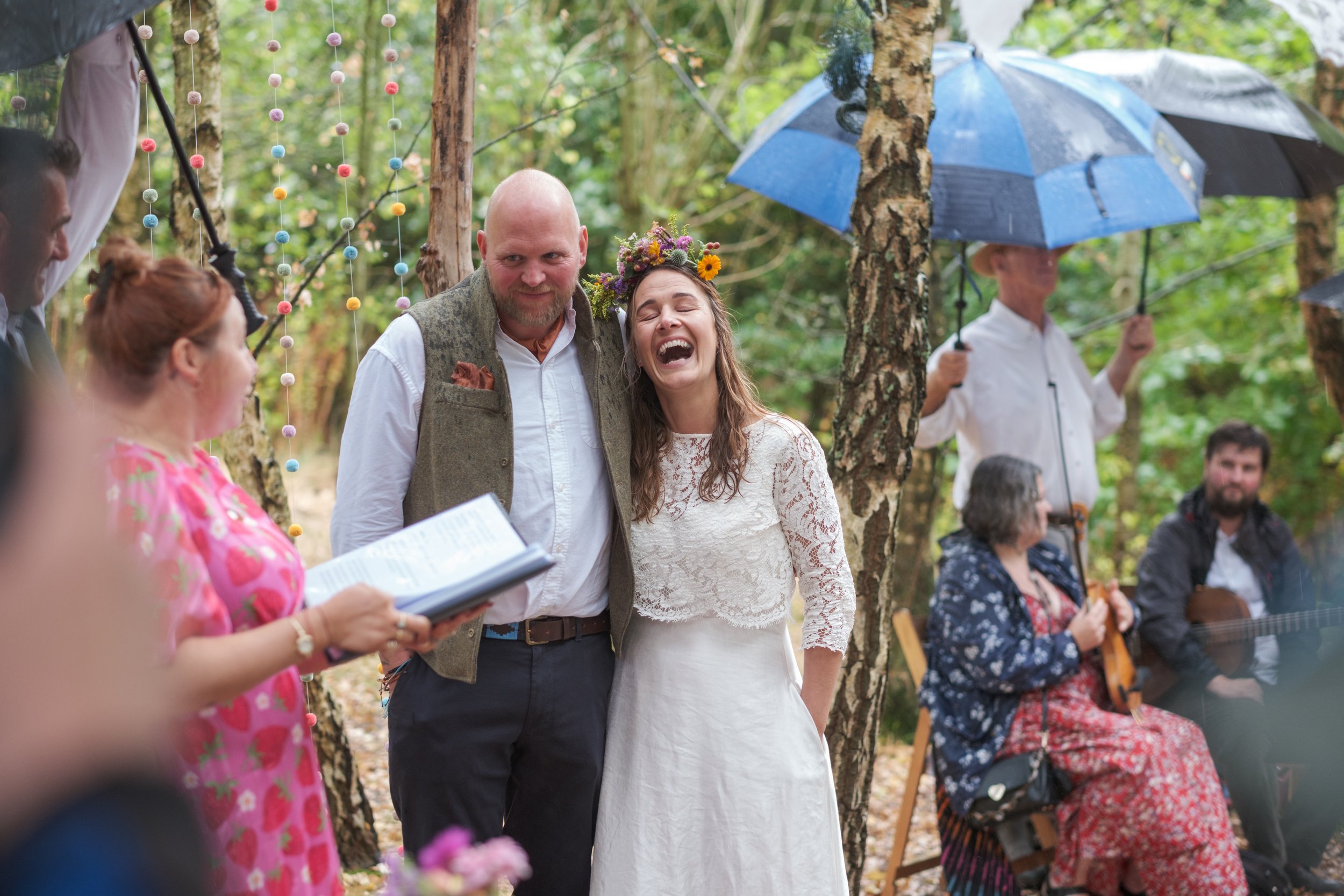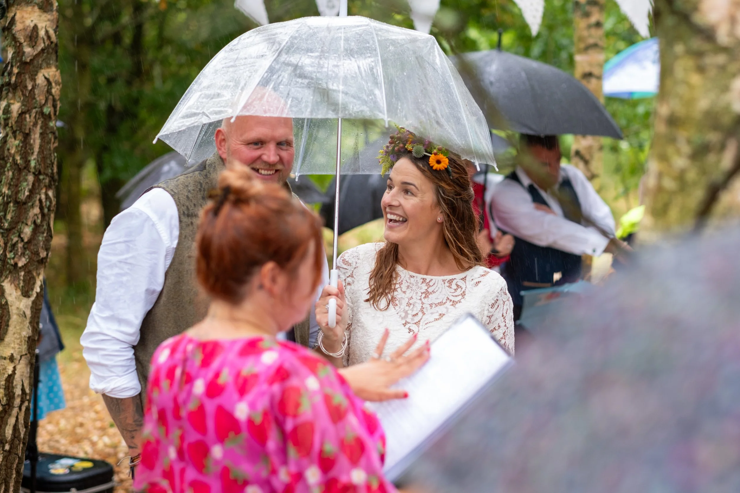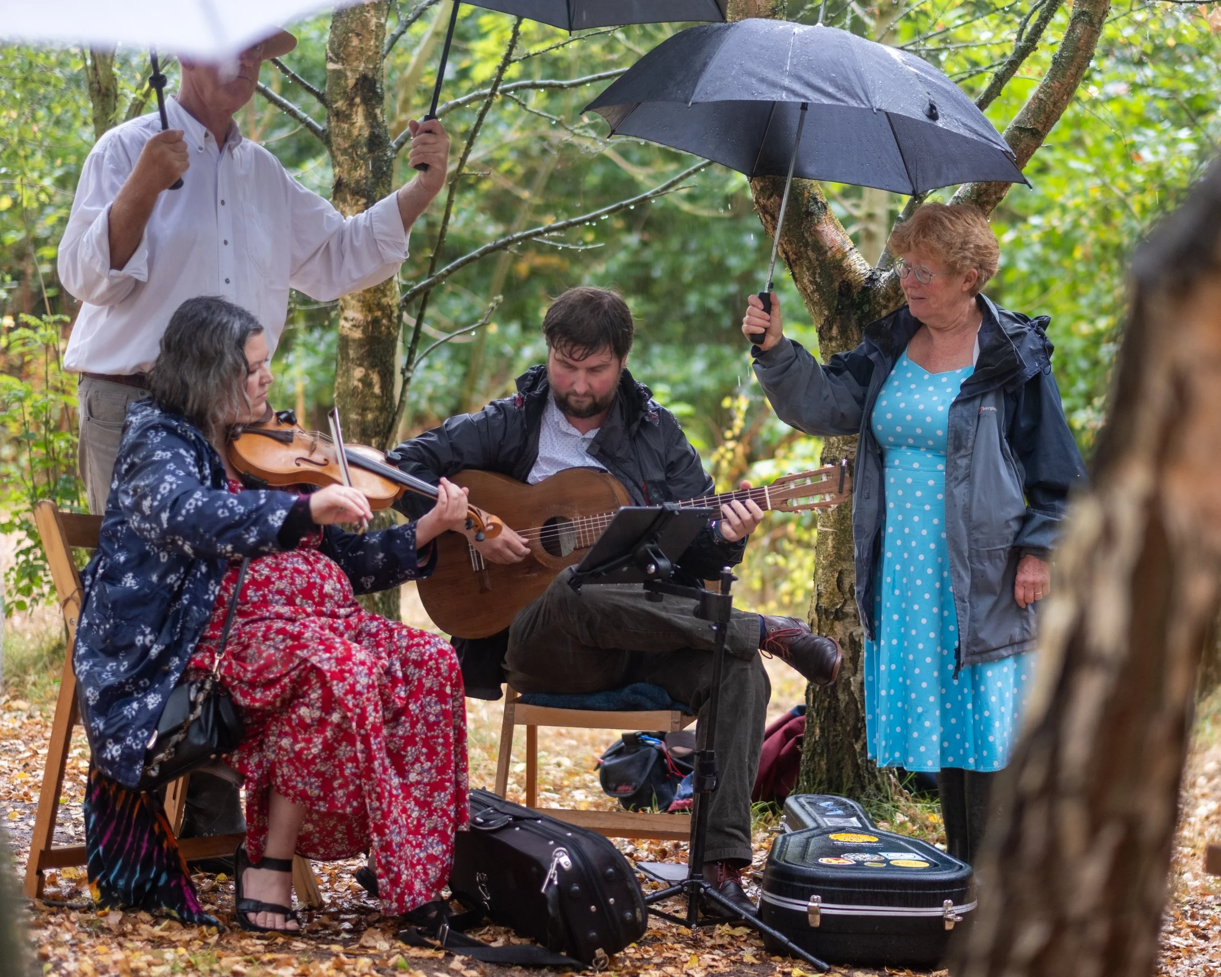 Ceremony hit hard. A pair of musicians played in the trees — fiddles and voices weaving through the birch, rain lashing around them. Vows exchanged under that shady canopy, the girls beaming and teary right there in the heart of it. Emotional doesn’t cover it. Proper heart stuff.