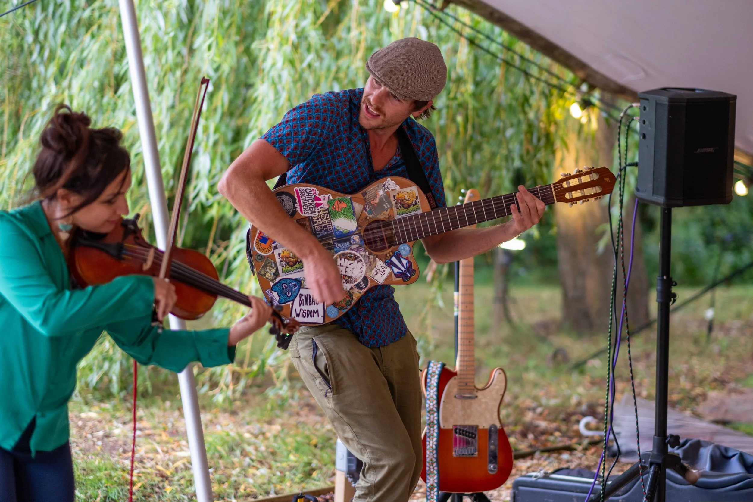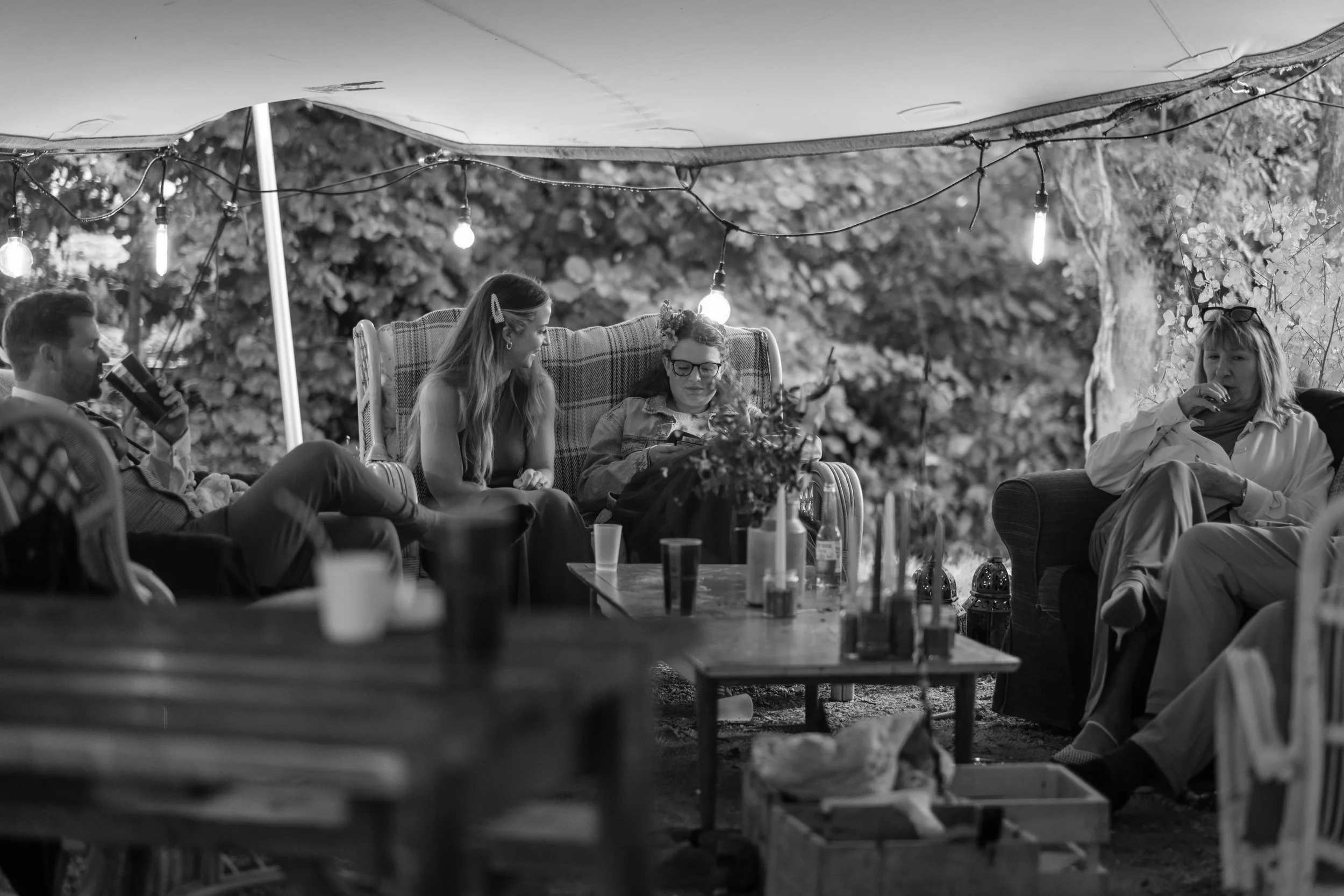 Stretch marquee stretched out cosy for the meal — views to the woods, fairy lights kicking in as daylight faded. Those same musicians set up at the edge of the marquee, people gathered around them, playing through dinner. The girls danced in their seats, guests grinning, forks paused mid-bite. Downpour thundered outside, but inside? Warm chaos, speeches landing heavy, food hitting the spot.